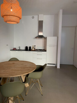 Je betreedt het appartement via een ruime entree/hal. Vanuit daar kom je in de lichte, ruime woonkamer die door de open indeling veel ruimte biedt voor zowel een gezellige zithoek als een eethoek. De open keuken is van alle gemakken voorzien, met een moderne gaskookplaat, een koelkast, een combi-oven-magnetron en een vaatwasser.