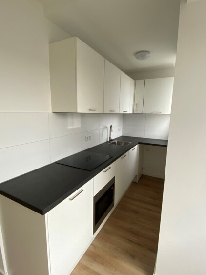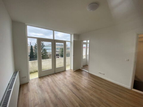 Bij binnenkomst in de woning kom je eerst in de hal, die toegang geeft tot de grote en lichte woonkamer met open keuken. De open keuken is uitgerust met moderne inbouwapparatuur, zoals een inductiekookplaat, oven en koelkast. De woning beschikt verder over een aparte slaapkamer van ca 5 m2. Ook is de badkamer compleet gerenoveerd en is er een balkon aanwezig.