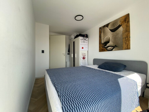 Via de entree betreed je het appartement van 55m2 op de eerste verdieping en neem je direct de trap omhoog naar de woonkamer met open keuken. De keuken is modern uitgevoerd en voorzien van een inductiekookplaat, koelkast, vaatwasser en een combinatie oven-magnetron. De badkamer beschikt over een douche en wastafelmeubel. Het appartement heeft twee ruime slaapkamers en een dakterras.