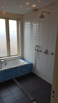 - Geheel betegelde badkamer (bathroom; 9 m2), met ligbad, stortdouche, vaste wastafel met spiegel en handdoekradiator.