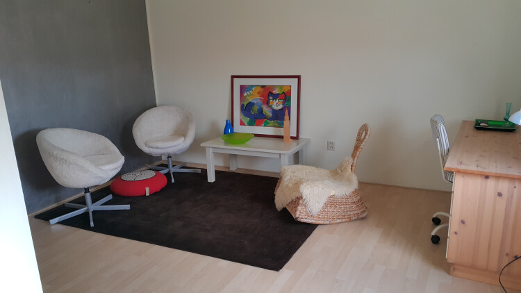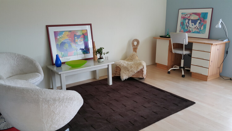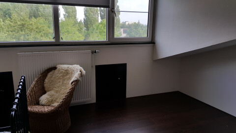 De etage bevindt zich op de bovenste etage van ons huis en bestaat uit twee kamers van ongeveer 15-20 m2 per kamer. De badkamer bevindt zich 1 etage lager. Koken kan in de open keuken van de woonkamer.